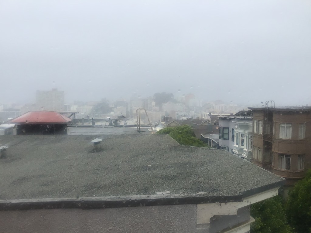 All gray, all wet, the pane spotted with rain, gusts of wind roaring and diving around hills and buildings like invisible, giant, avenging angels. The green treetops just over the roofs nearby thrash and pitch. Thunder rumbles and scrapes (never bangs) overhead. Not many cars are visible on the rising slope of our street blocks away, and the ones approaching have their headlights on, even though its just half past noon. That road, as always during storms, vanishes at its summit into gray nothingness. The Golden Gate Bridge and the Marin headlands have been erased.